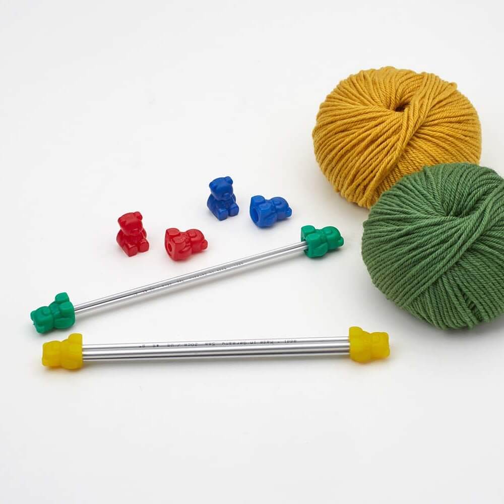addiBears Maschenbären – 8 praktische Helferlein für verschiedenen Stricknadelgrößen. Damit werden Strumpfstricknadeln, Jacken-Stricknadeln und Rundstricknadeln zusammengehalten und gesichert.