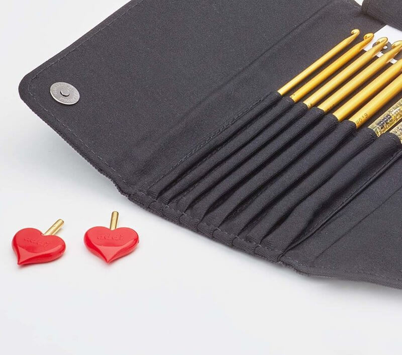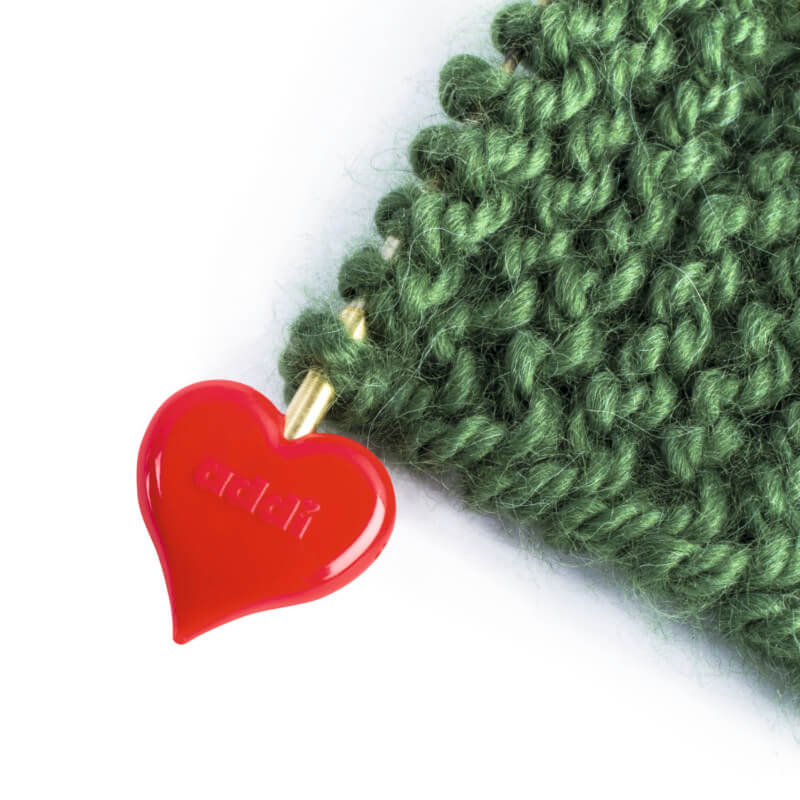 addiClick HeartStopper Seilenden – Zwei Herzen mit doppeltem Nutzen. Entweder kann mit den addiClick Häkelnadeln problemlos und bequem tunesisch gehäkelt werden oder man kann ein Strickprojekt auf einem Seil „parken“.