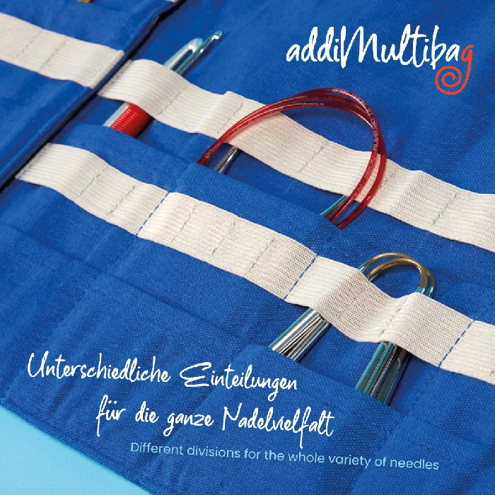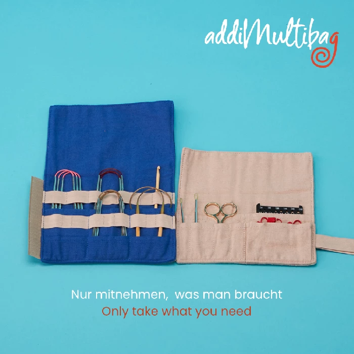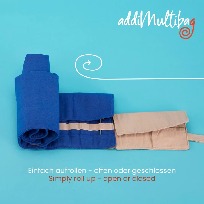 Das neue addiMultibag Roll-Etui ist die clevere Lösung für Ordnung im Handarbeitsalltag. Ob Rundstricknadeln, Häkelnadeln, Nadelspiele, addiClick, addiCraSyTrios oder Zubehör – hier findet einfach alles seinen Platz.