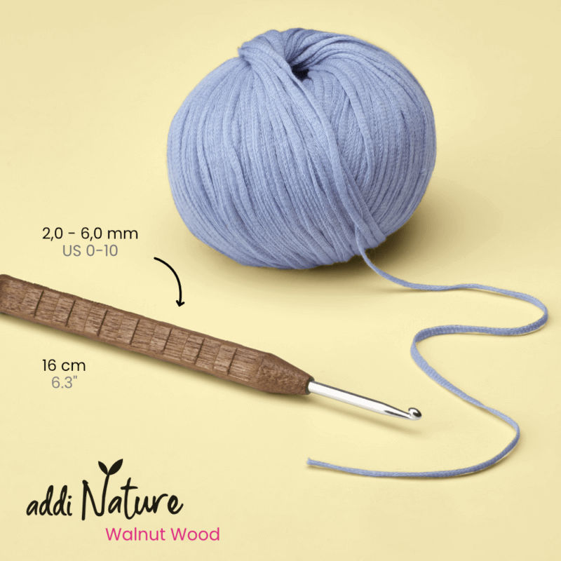 addiNature Walnut Wood Wollhäkelnadel – Eine Besonderheit durch das warme Holz und die Oberflächenveredelung. Der raffinierte Walnussholzgriff mit Novel-Struktur ist mit ca. 9 Gramm konkurrenzlos leicht. Die Form der Nadel führt zu einem völlig neuen Häkelerlebnis.