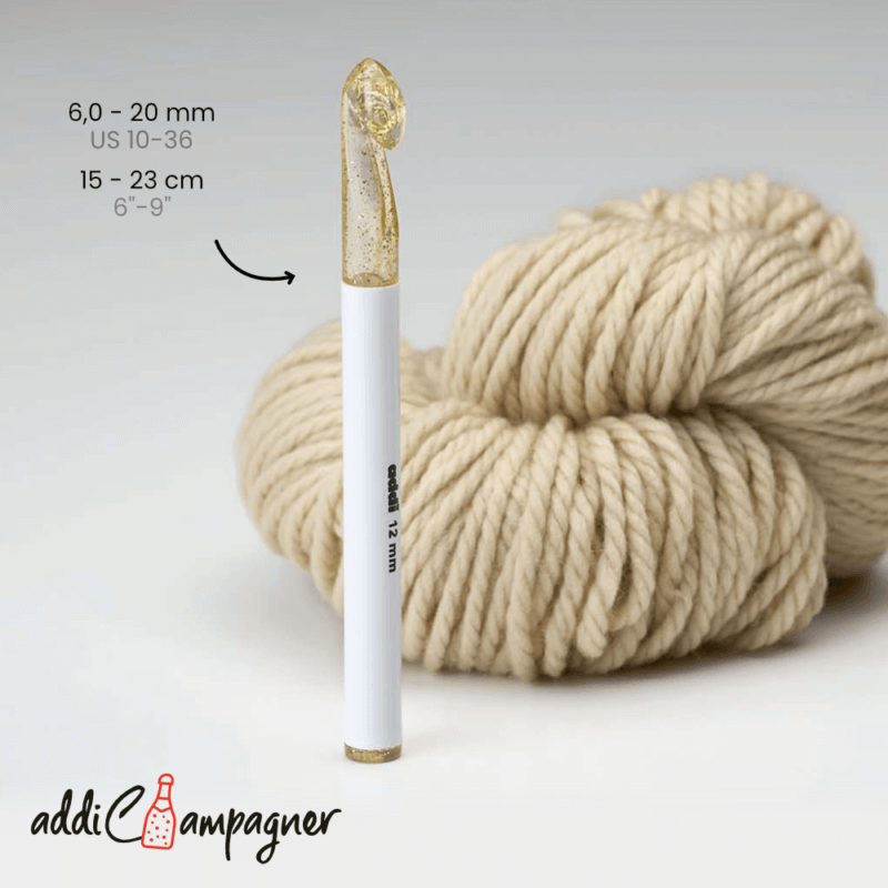addiChampagner Wollhäkelnadel – Auch bei den Häkelnadeln geht es königlich zur Sache. Luxuriöse, leichte Nadeln mit Goldglitter versehen, lassen dicke Wolle unbeschwert zu einem schönen Häkelwerk werden.