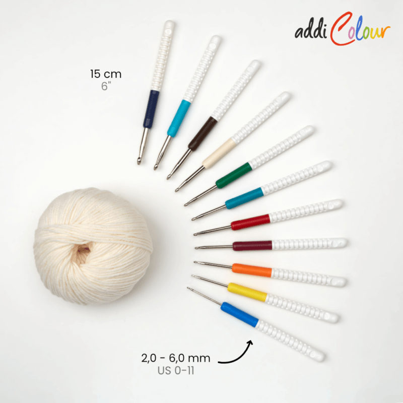 addiColour Wollhäkelnadel – Der Klassiker unter den addi Häkelnadeln. Durch das drehbare Vorderteil passt sich die Häkelnadel der Handform an und durch den verlängerten Griff wird die Handhabung lockerer und beugt Verspannungen vor.