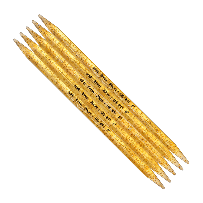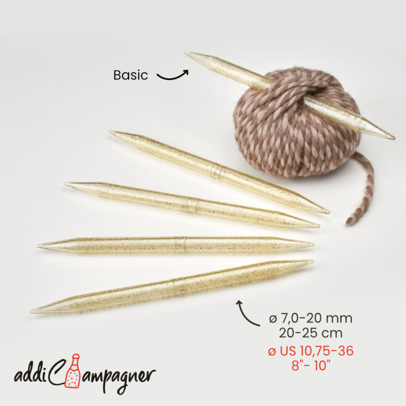 addiChampagner Nadelspiel – Royal geht es auch bei dem Nadelspiel zu. Die Champagnernadeln mit Goldglitter überzeugen mit dem perfekten Übergang. Dicke Wolle wird perfekt verstrickt, die Nadel fühlt sich warm an und liegt angenehm in der Hand. Und wie alle anderen Nadeln auch: Made in Germany.